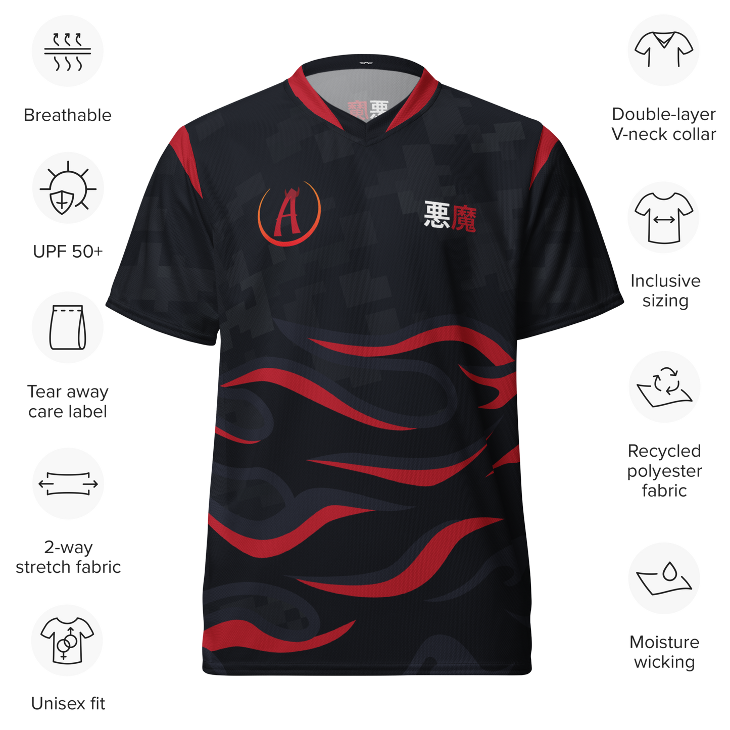 Looking for the perfect sports jersey? We have you covered—made of 100% recycled polyester fabric, this shirt is breathable, moisture-wicking, and has a double-layered v-neck collar that creates a premium look.