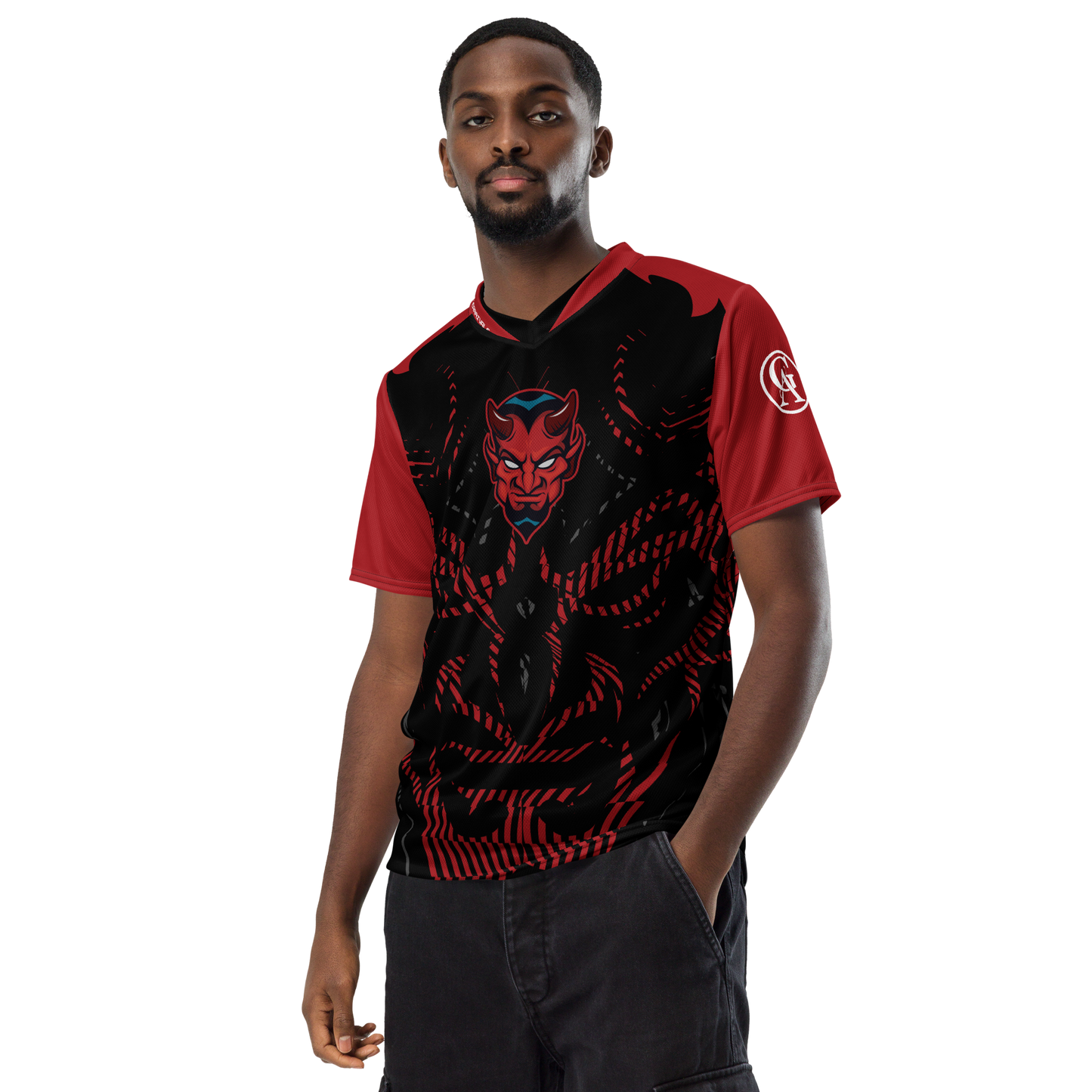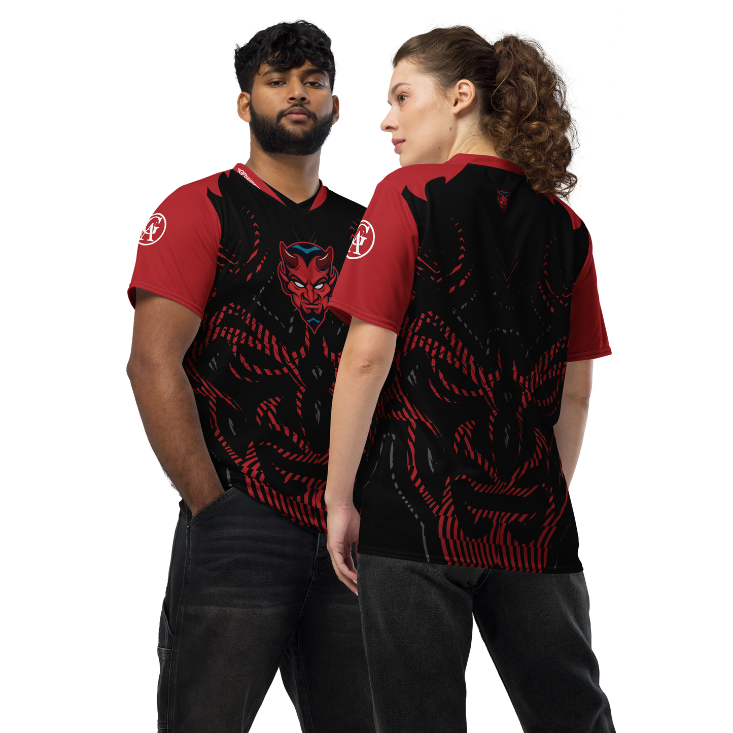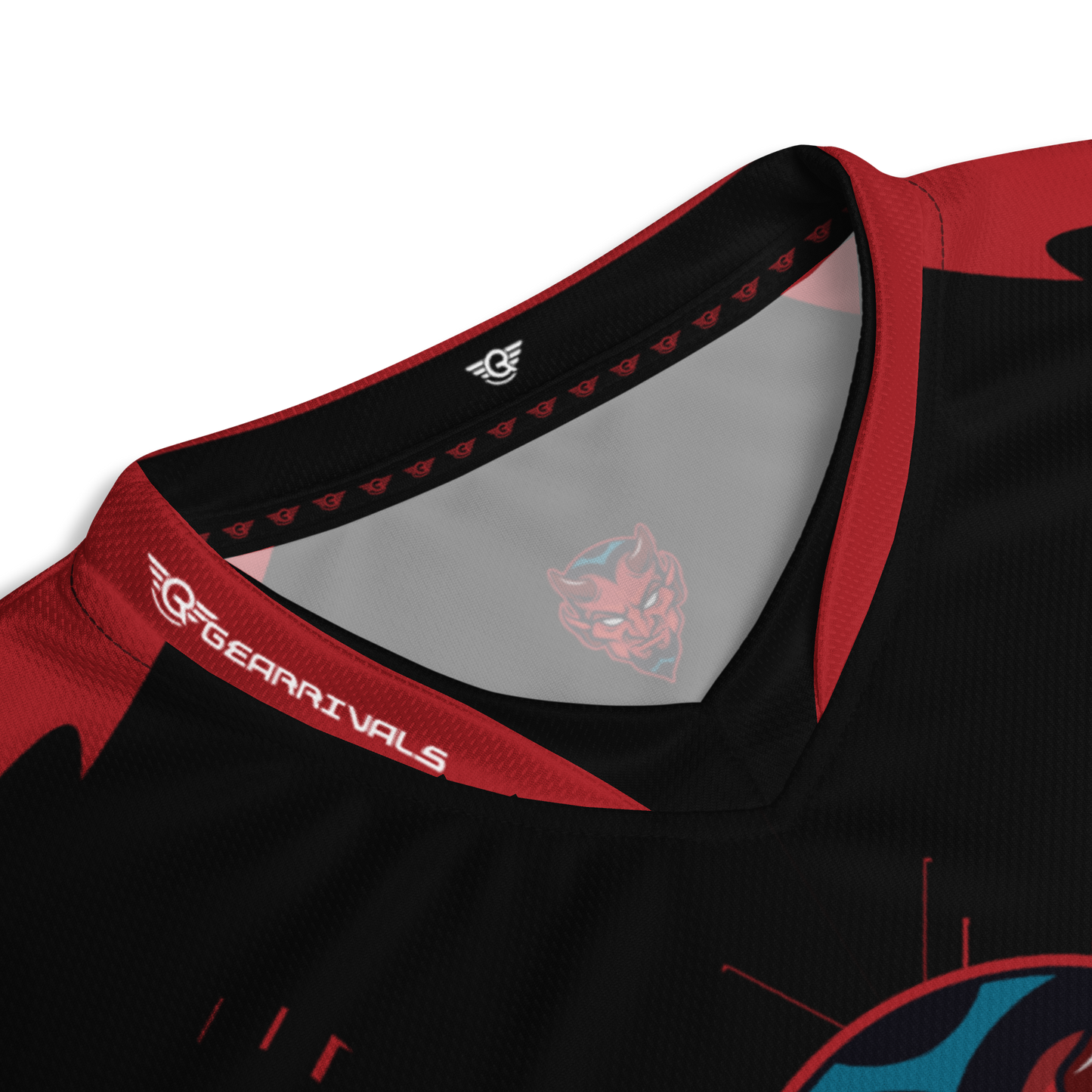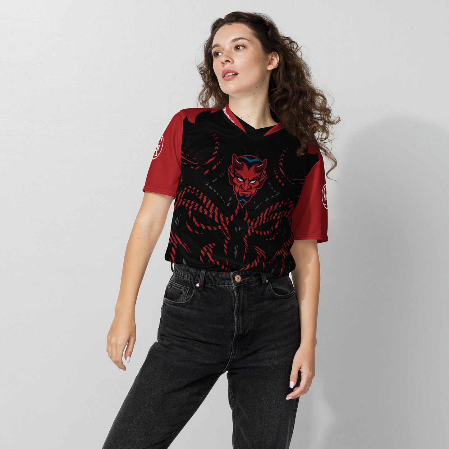 Looking for the perfect sports jersey? We have you covered—made of 100% recycled polyester fabric, this shirt is breathable, moisture-wicking, and has a double-layered v-neck collar that creates a premium look.