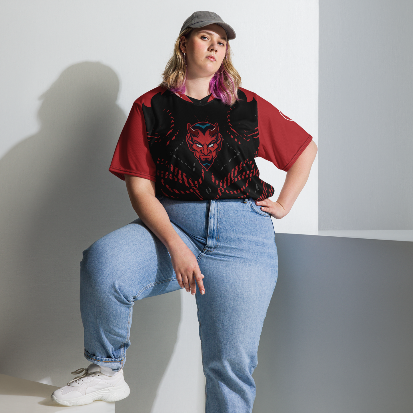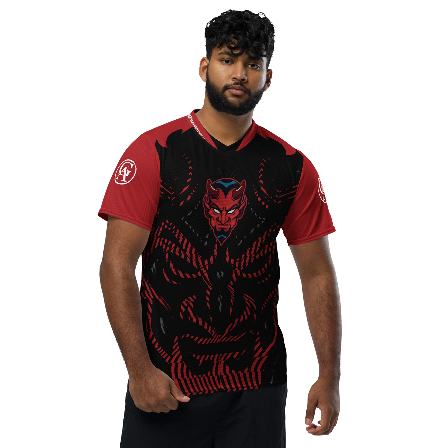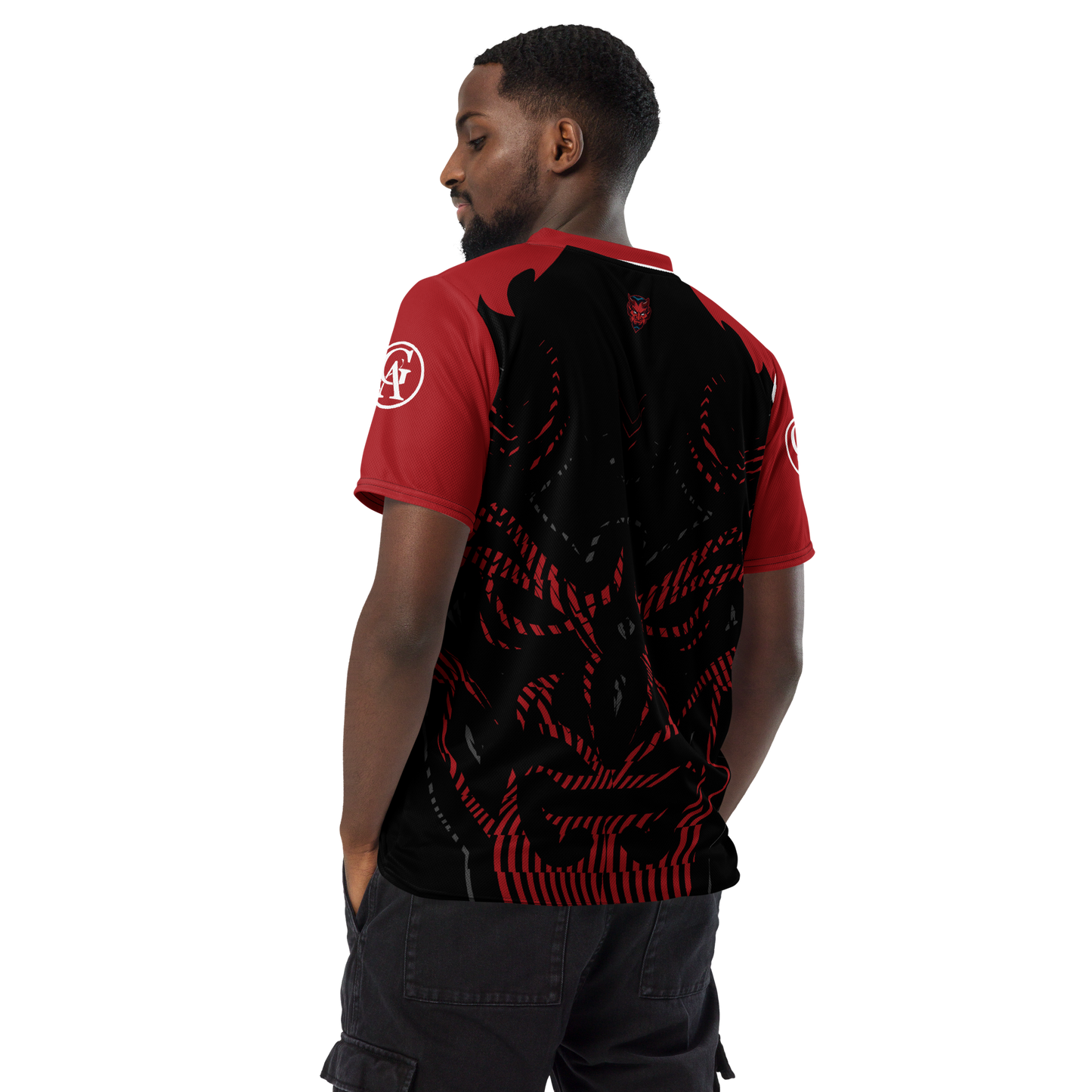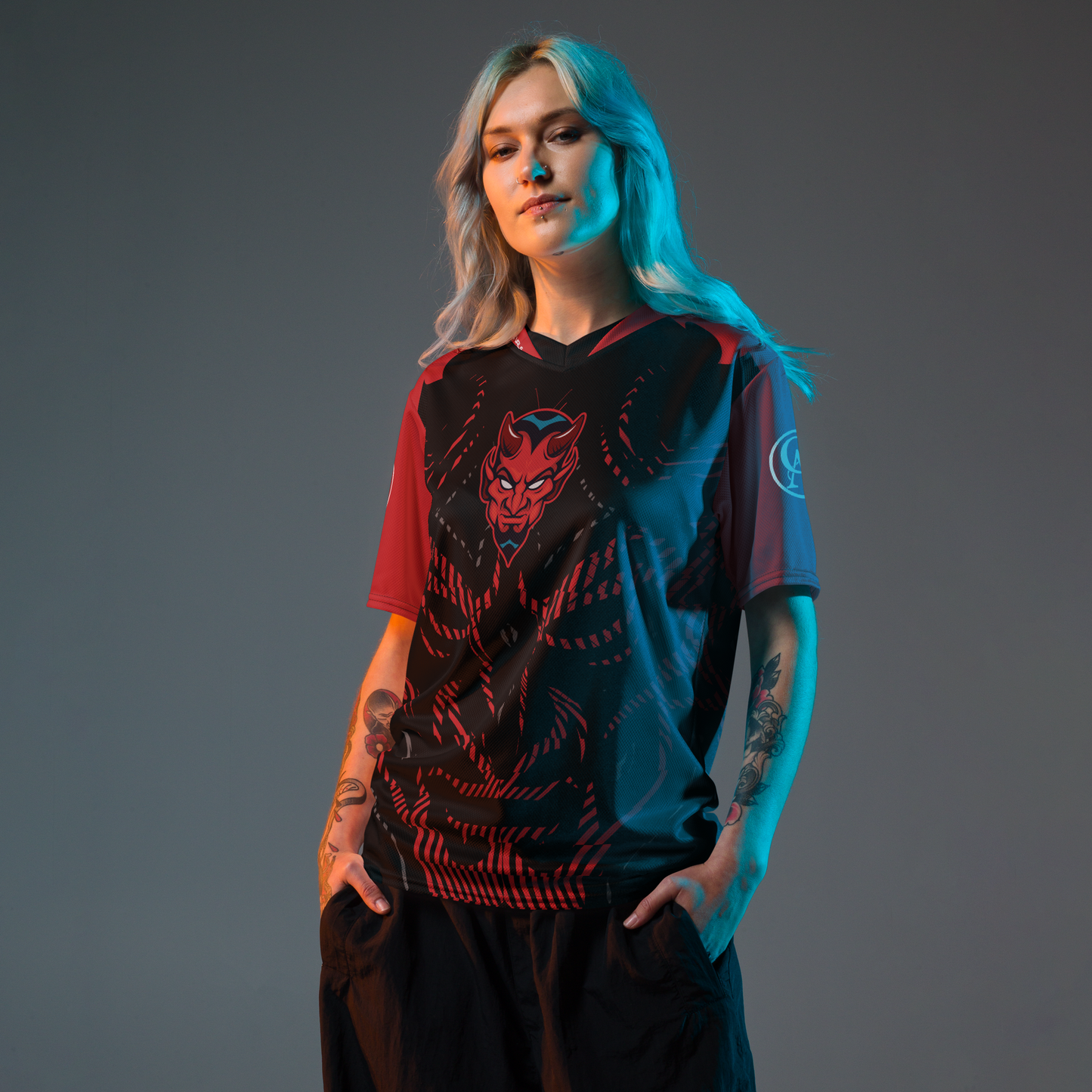 Looking for the perfect sports jersey? We have you covered—made of 100% recycled polyester fabric, this shirt is breathable, moisture-wicking, and has a double-layered v-neck collar that creates a premium look.