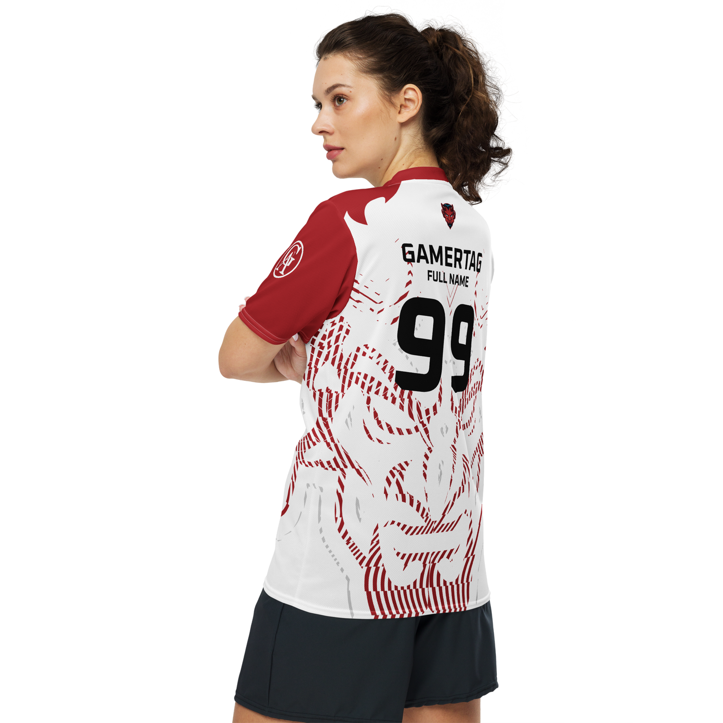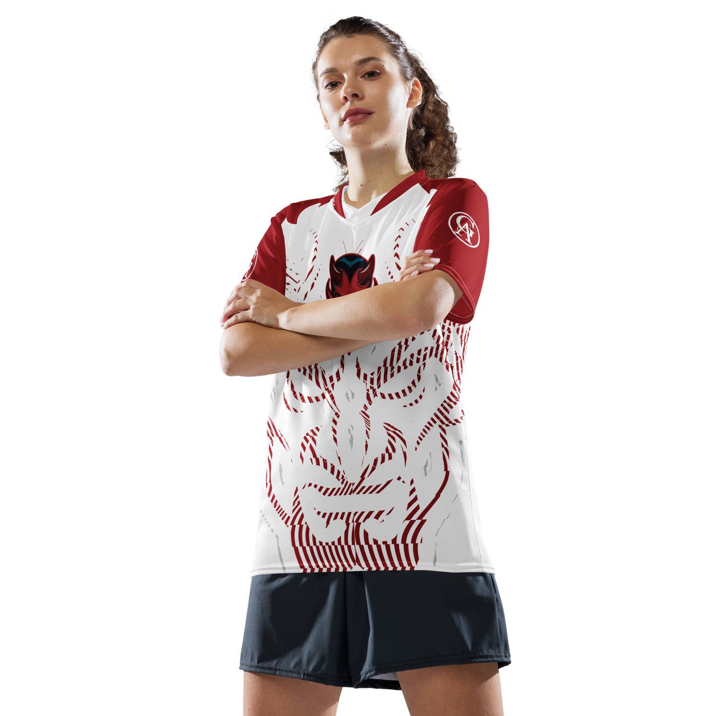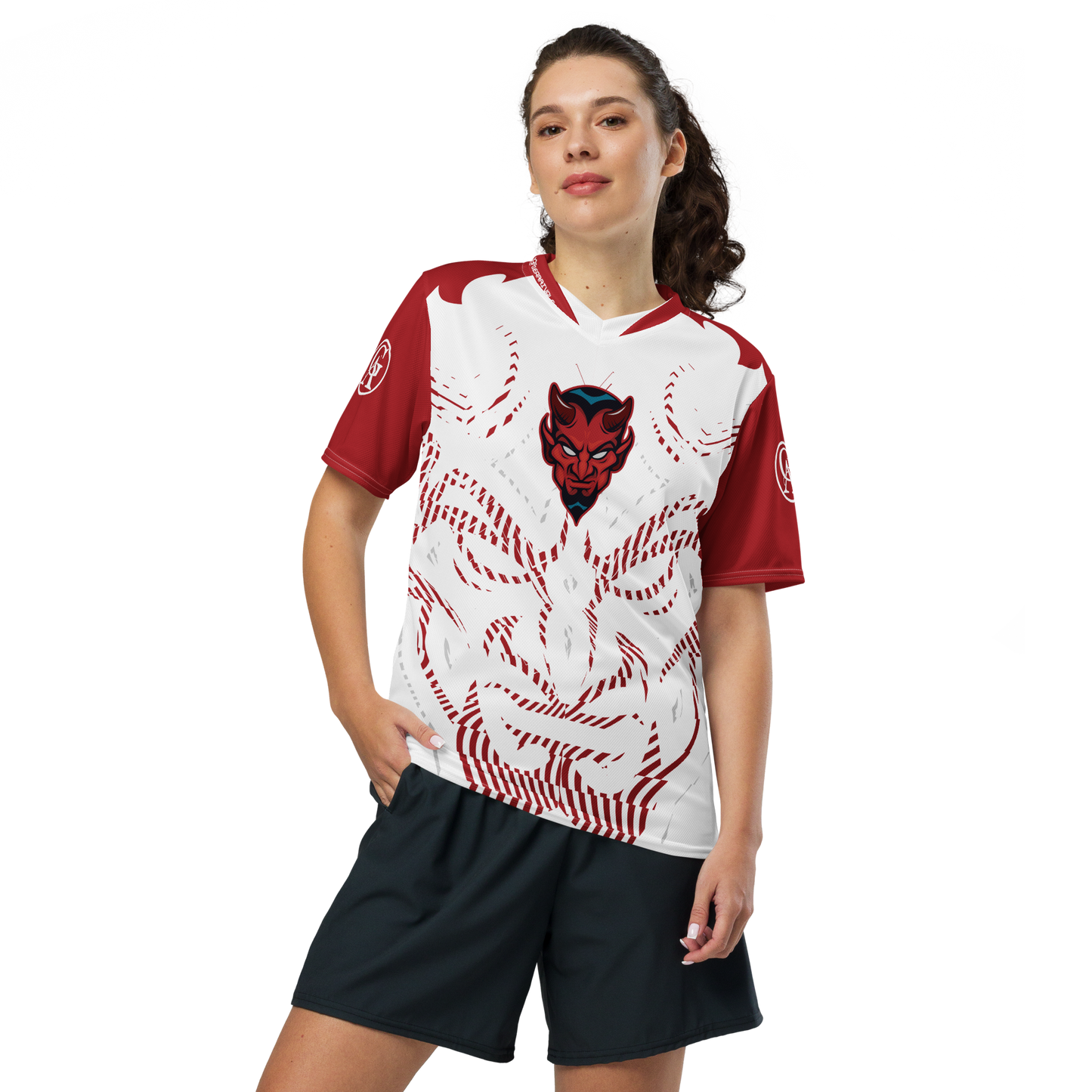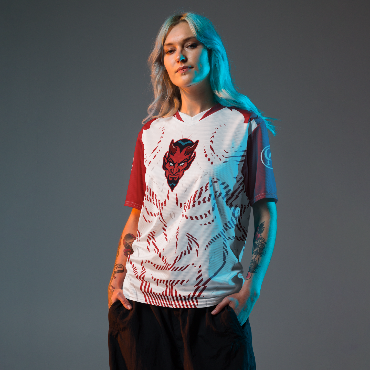 Looking for the perfect sports jersey? We have you covered—made of 100% recycled polyester fabric, this shirt is breathable, moisture-wicking, and has a double-layered v-neck collar that creates a premium look.