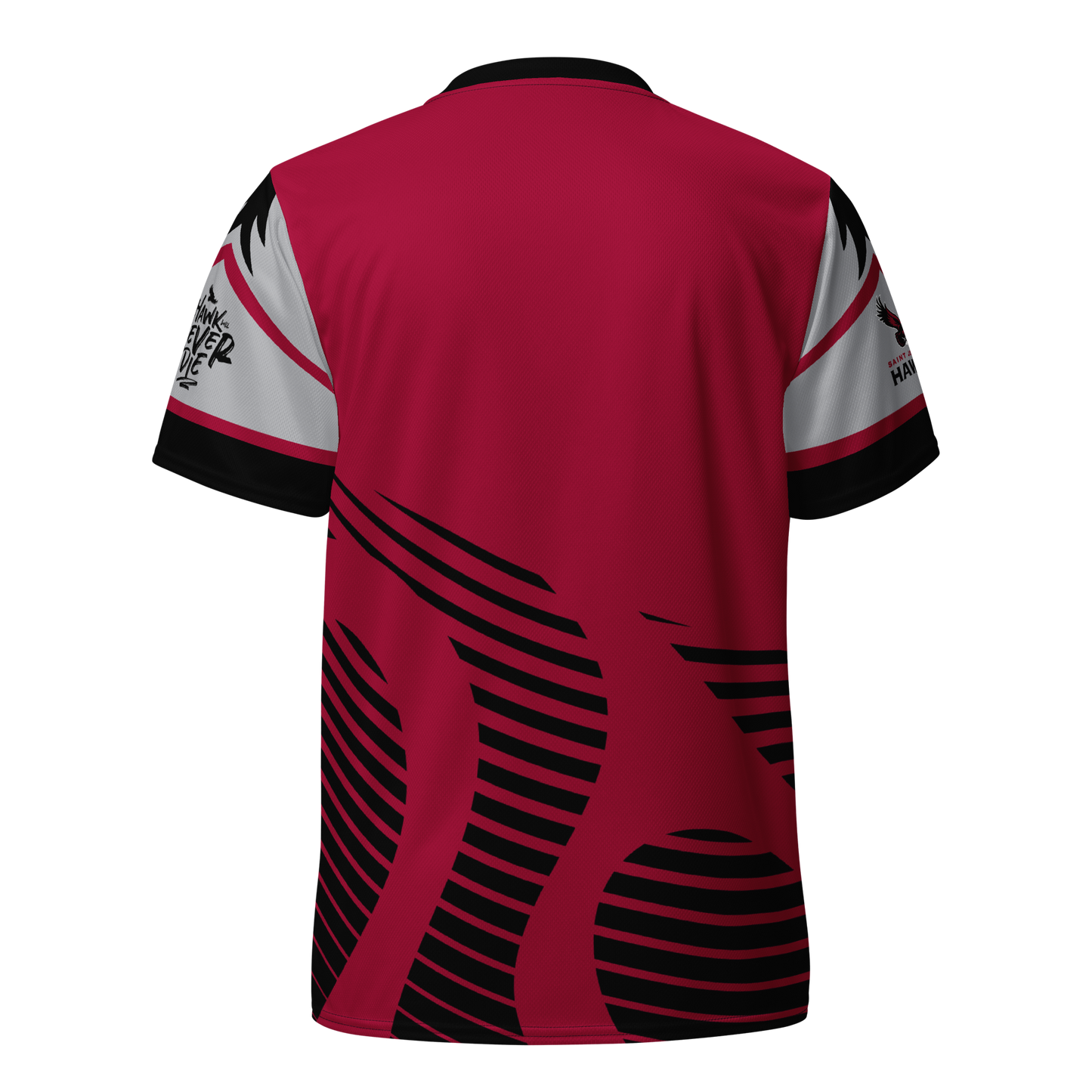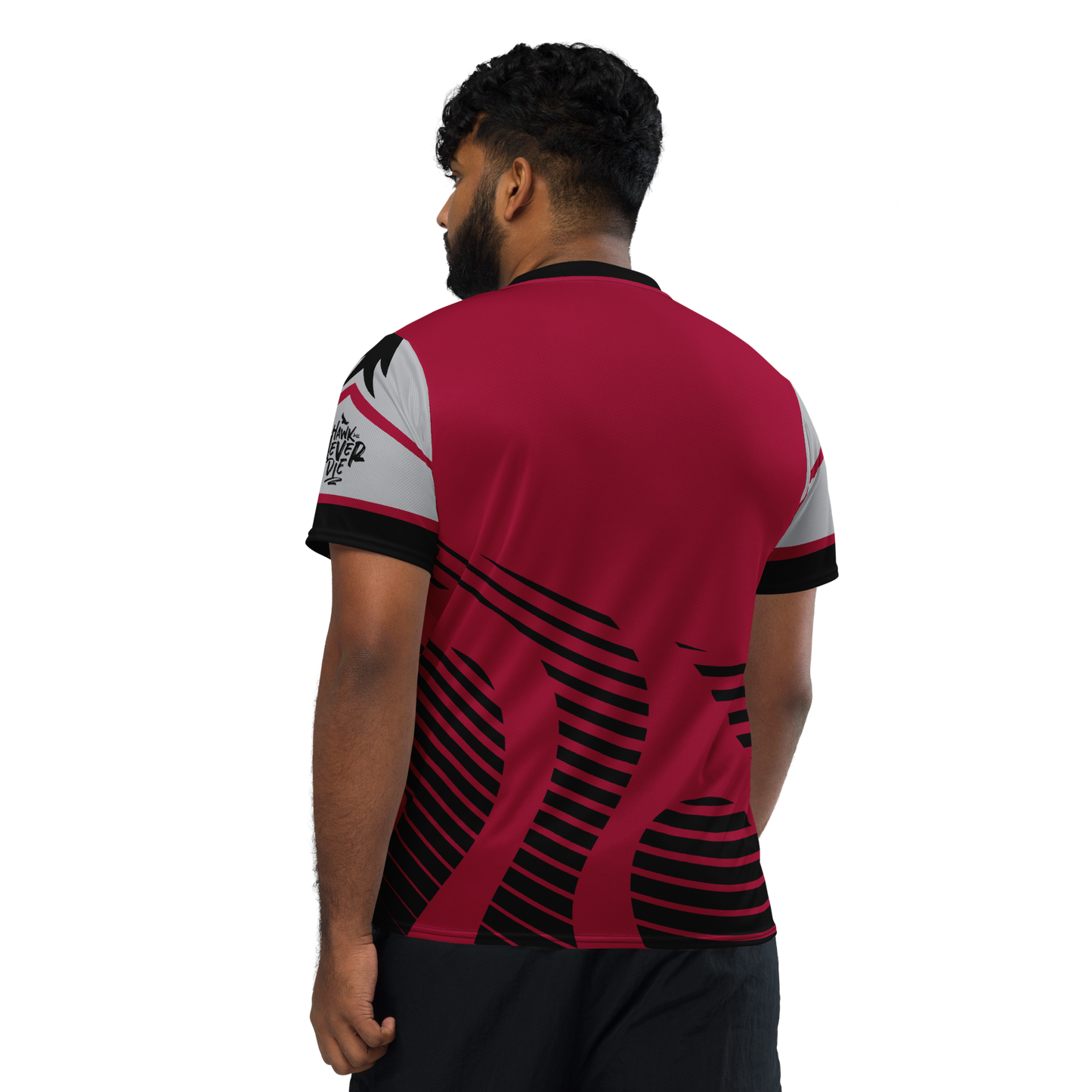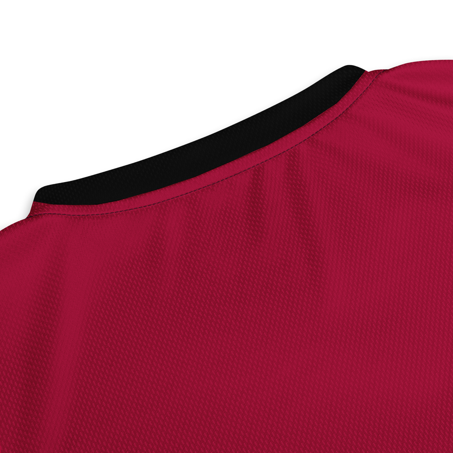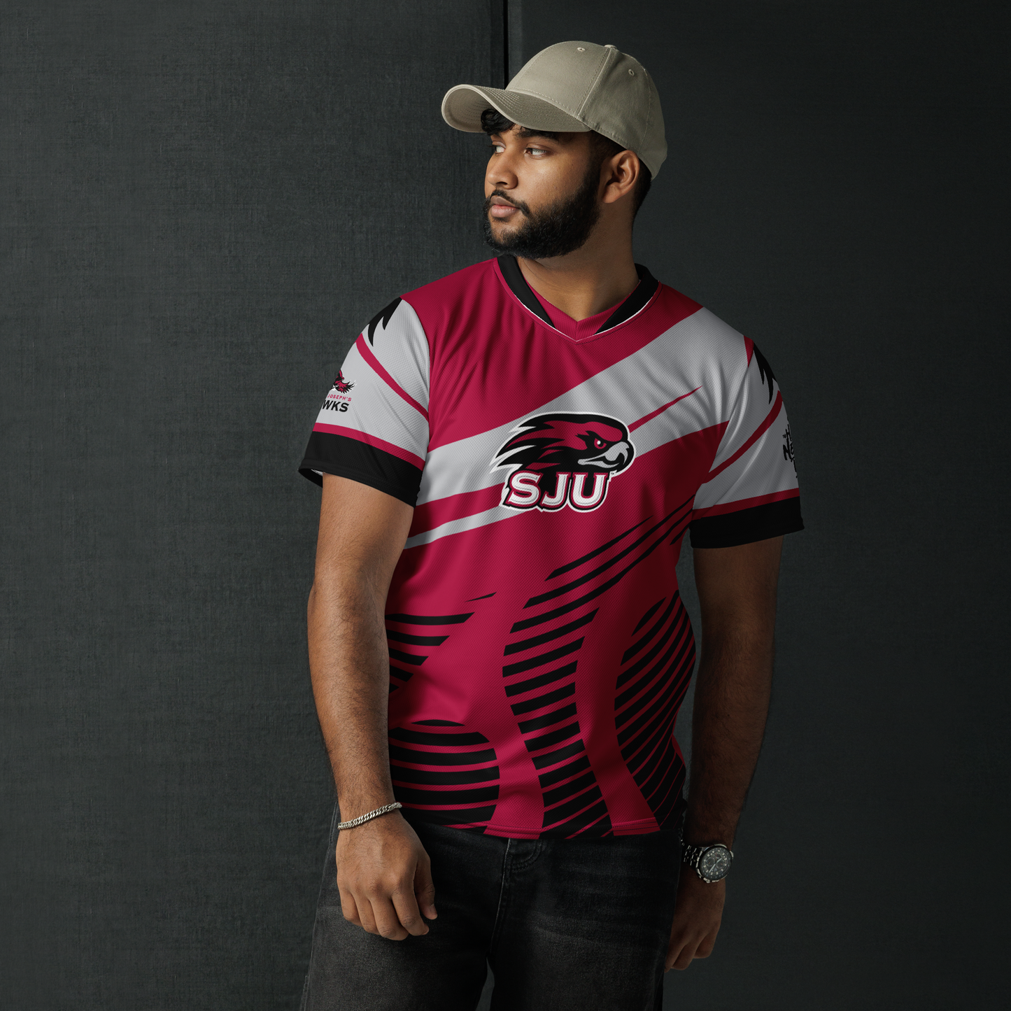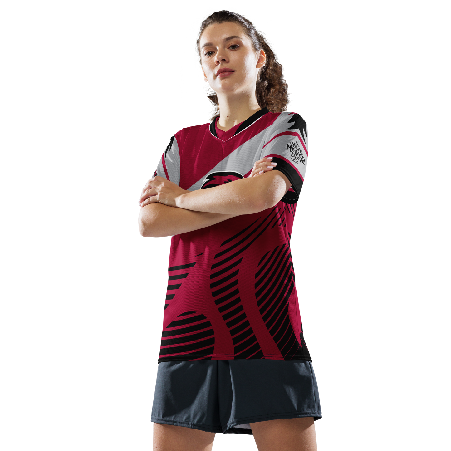 Looking for the perfect sports jersey? We have you covered—made of 100% recycled polyester fabric, this shirt is breathable, moisture-wicking, and has a double-layered v-neck collar that creates a premium look.